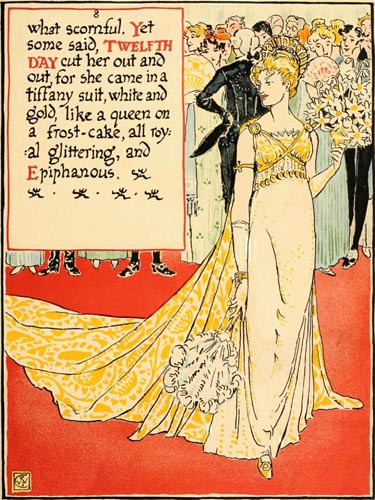 what scornful. Yet some said, TWELFTH DAY cut her out and out, for she came in a tiffany suit, white and gold, like a queen on a frost-cake, all royal glittering, and Epiphanous.