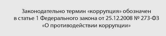 Законодательно этот термин обозначен в статье 1 Федерального закона от 25.12.2008 № 273-ФЗ «О противодействии коррупции», где коррупция определена как: