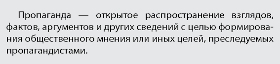 «Большая советская энциклопедия» определяет пропаганду как распространение политических, философских, научных, художественных и других взглядов и идей с целью их внедрения в общественное сознание и активизации массовой практической деятельности.
