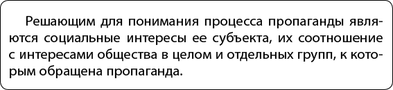 Решающим для понимания процесса пропаганды являются социальные интересы ее субъекта, их соотношение с интересами общества в целом и отдельных групп, к которым обращена пропаганда. Это определяет ее содержание и оказывает существенное влияние на выбор форм, методов и средств пропаганды.