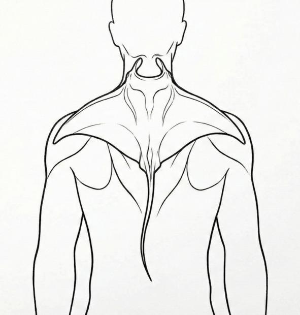 Представьте себе этого большого морского ската. У него широкие крылья-плавники, которые плавно волнообразно двигаются в воде. Голова ската — это верхняя часть трапеции, там, где она крепится к затылку. Крылья ската — это части трапеции, которые покрывают плечи и лопатки. А хвост — узкая нижняя часть, которая спускается к солнечному сплетению.