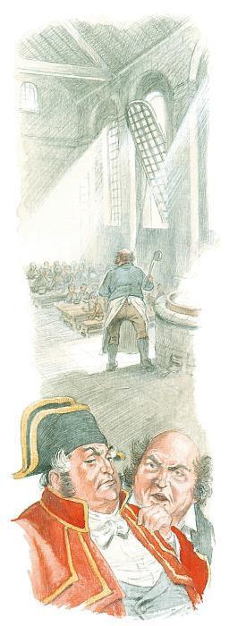 Помещение, в котором кормили мальчиков, представляло собой большой холодный зал с кирпичными стенами, где стоял длинный деревянный стол. В одном конце зала находился глубокий медный котёл, из которого надзиратель в белом фартуке разливал похлёбку. Кормили детей жидким водянистым варевом, где редко попадались зёрна овса.