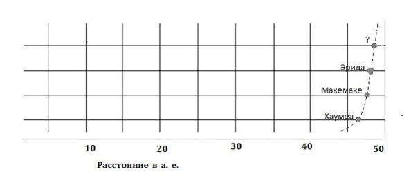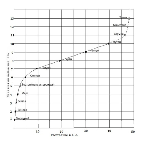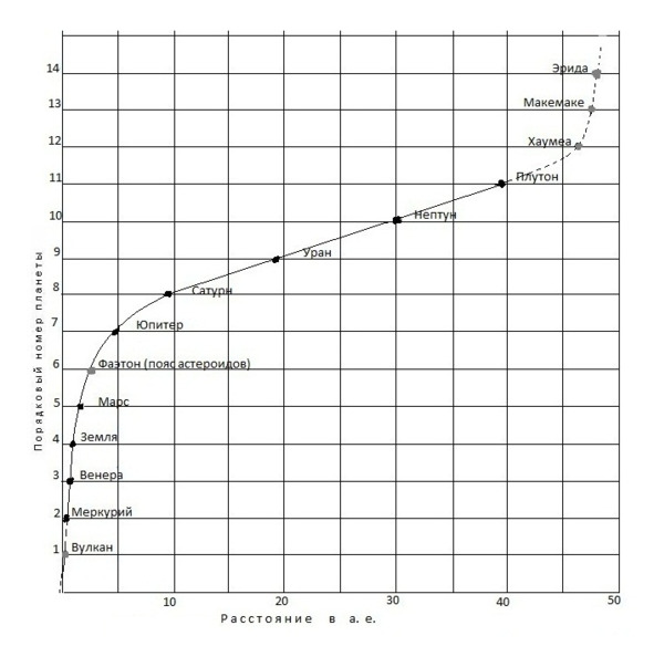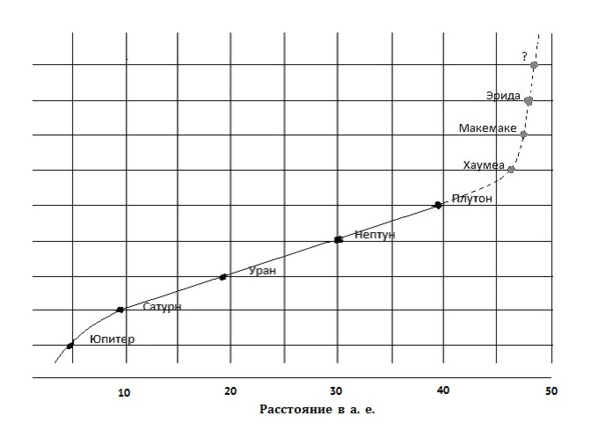Продолжив линию вверх, можно определить расположение заплутоновых планет. При этом возможно два варианта построения кривой: