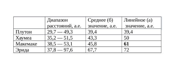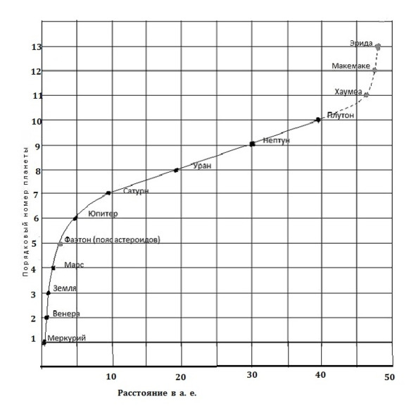 При средних значениях все планеты входят в астрономический диапазон, но последняя, Эрида располагается не по линии кривой. Вероятно, сказывается большой диапазон ее положений и, соответственно, недостаточная точность определения ее местонахождения.
