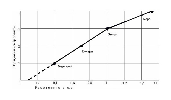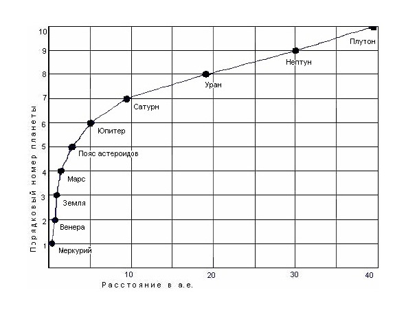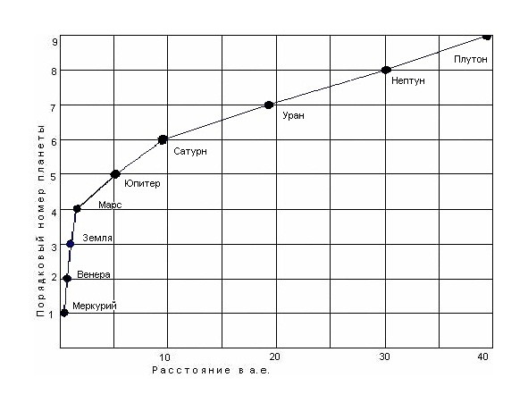Построим график распределения официально известных нам планет. По оси абсцисс — расстояние от Солнца до планеты в астрономических единицах, по оси ординат — порядковый номер планеты от Солнца (рис. 1):