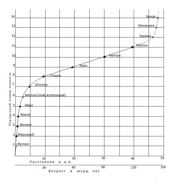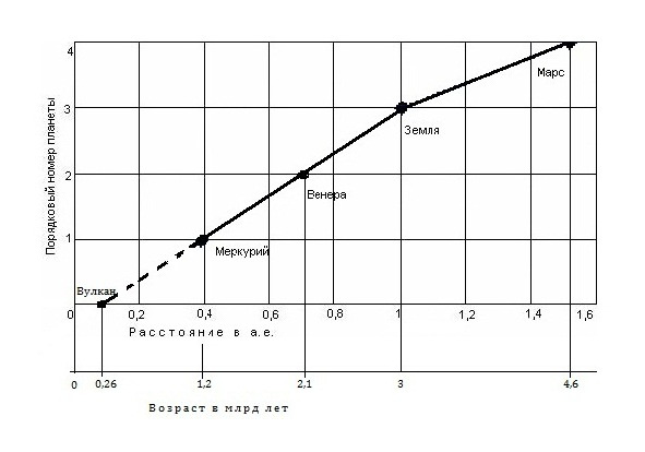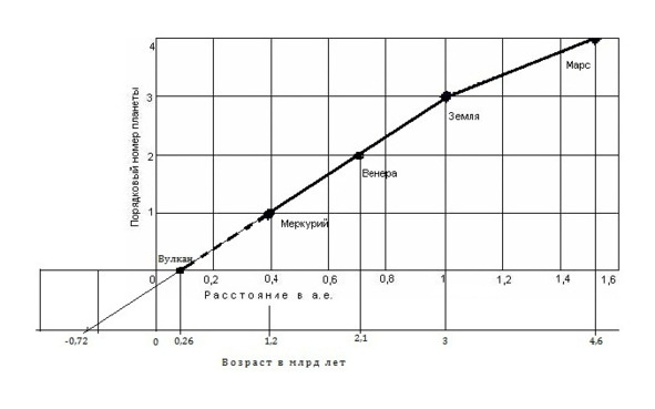 Если эту дату принять для начала отсчета, то Земля, как планета образовалась 3,53 миллиарда лет назад. Соответственно, Венера родилась 2,46, Меркурий — 1,39, а Вулкан — 0,32 млрд. лет назад (рис. 11):