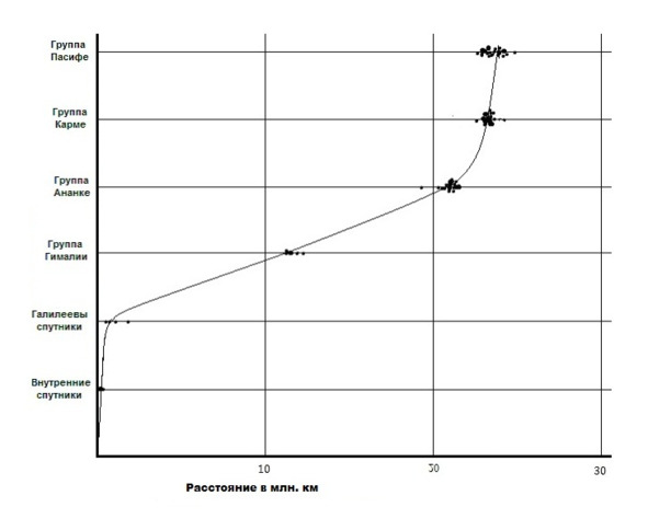 Из-за приобретения собственного движения куски оболочки иногда не слепляются друг с другом, а начинают совместное вращение. Получаются планеты со спутниками наподобие Луны. Или с несколькими, как у Марса. Планета может и вообще не сформироваться. Тогда на месте старой оболочки остается большое количество комков разного размера. Типа Пояса астероидов и колец, как у Юпитера, Урана, Сатурна. Потому для расчетов необходимо брать не отдельно каждый планетоид и спутник, а их группы, собранные в кольца. Исходя из этого, построим график Юпитера, как дочерней звезды (рис. 14):