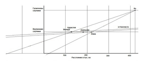 Судя по графику, мы накануне очередной вспышки Юпитера. К сожалению, невозможно точно вычислить эту дату. В отличие от материнской звезды звезды-дочери, будучи уже вторичны, не в состоянии произвести крупную планету и рождают россыпь небольших планеток-спутников. Количество спутников Юпитера даже в ближних группах-кольцах велико, а их расстояния сильно различаются между собой. Все это, вместе взятое, дает слишком большой разбег значений (от прошедших 80 млн. лет до бесконечности в будущем — здесь показан только фрагмент графика из-за невозможности размещения полного) и не позволяет выявить истинную временную картину (рис. 15):