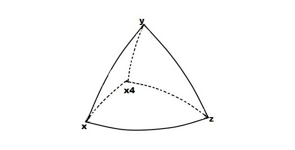 Одним из вариантов модели четырехмерного пространства может служить равномерная трехгранная пирамида, имеющая четыре координаты. При условии его вывернутости наизнанку. То есть вершины пирамиды будут не начальными координатами, а конечными, бесконечными. Таково свойство четырехмерного пространства в нашем трехмерном — вывернутость. Получается, что маленький предмет здесь приобретает гигантские, почти бесконечные размеры, а большой — наоборот, микроскопические. Четвертая координата выворачивает наш мир наизнанку. Это получается из-за особенности отображения в мерностях пространства. Нуль, стремящийся к бесконечности, и бесконечность, стремящаяся к нулю. Нам, трехмерникам, все кажется вывернутым, а для четырехмерников же это обычная четырехмерная система координат, как для нас декартова (рис. 16):