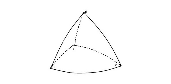 Почему именно трехгранная пирамида, а не куб, например, или иная фигура? — Необходимое условие — мерность во всех координатах должна быть одинаковой, все точки должны соединяться между собой напрямую. Это достигается только в трехгранной пирамиде. Здесь все координаты взаимосвязаны между собой одинаково, без искажений. В четырех- и выше-гранных пирамидах прямого соединения между всеми вершинами уже не получается. Помещенные в них предметы уже не будут соответствовать действительности.
