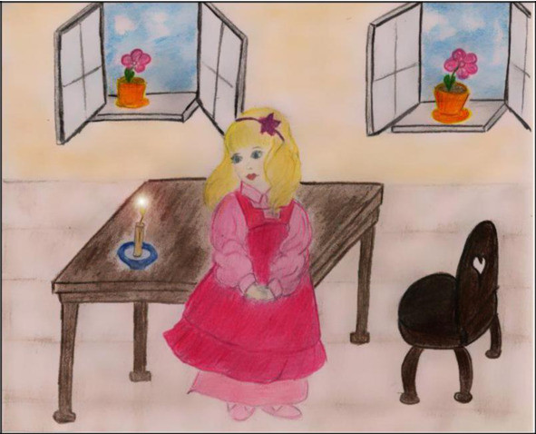 Вдруг в комнате стало светлее. Это свеча, стоявшая в глиняном подсвечнике на столе, начала ярко светиться. Маленькие огоньки оторвались от пламени, превратились в разноцветные шарики и заплясали вокруг головы девочки. Девочка радостно засмеялась и потянула ручки к огонькам.