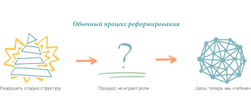 Простого ответа на этот вопрос до сих пор не существует. Чтобы трансформация оказалась удачной, требуется не только новая оболочка, но и смена образа мышления. Для классической иерархии менеджмента характерны административно-командный и прогностический подходы. Это означает, что иерархическая верхушка разрабатывает планы, которые реализуются на нижних уровнях пирамиды, а также контролирует ход исполнения посредством промежуточных управленческих структур.