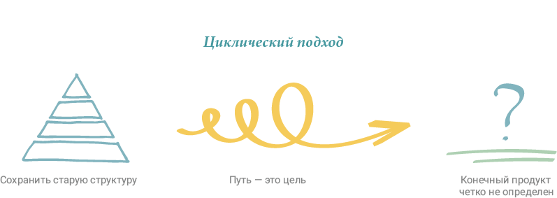Наш циклический подход помогает организациям трансформироваться собственными силами. Он отвечает не столько на вопрос «Что?» (получится в конце), сколько на вопрос «Как?» (мы туда доберемся). Очень часто предприятиям хочется хоть одним глазком глянуть в направлении «Что?»: они рисуют схемы, организовывают гильдии, формируют команды во главе со Scrum-мастерами. Но ключ к успеху лежит в ответе на вопрос «Как?», и для этого мы предлагаем несколько новых полезных инструментов.