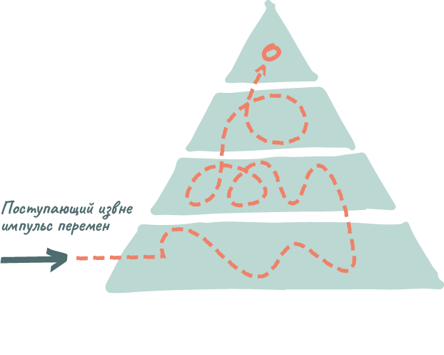 Зафиксировав изменения, этот датчик в старой пирамидальной системе должен донести информацию по инстанциям до самого верха, где принимаются решения. Но к тому моменту, когда она туда попадает, проходят недели, месяцы, а иногда и годы. И даже если импульс перемен доходит до цели, то принятое решение должно вновь спуститься по инстанциям до самого низа, прежде чем в деятельности предприятия что-то действительно поменяется. Это не идет на пользу ни организации, ни людям, которые в ней работают.