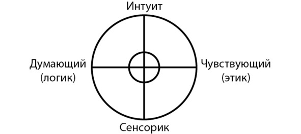 Если взглянуть на «компас» Юнга, можно увидеть, что люди делятся на сенсориков (ощущающих) и интуитов — по способу получения информации из внешнего мира; и на логиков (мыслящих) и этиков (чувствующих) — по внутренней мотивации и объяснению своих поступков.