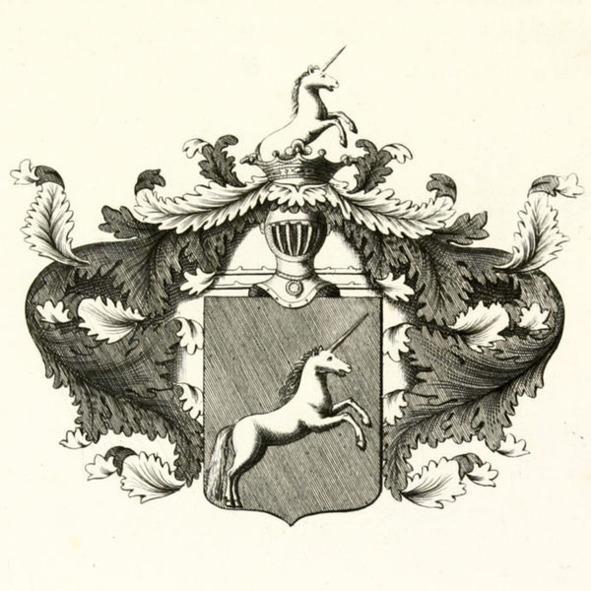 В щите имеющем зеленое поле изображен серебряный Единорог. Щит увенчан обыкновенным дворянским шлемом, с дворянскою на нем Короною, из-за которой выходит означенный в щите Единорог. Намет на щите зеленый, подложенный серебром.