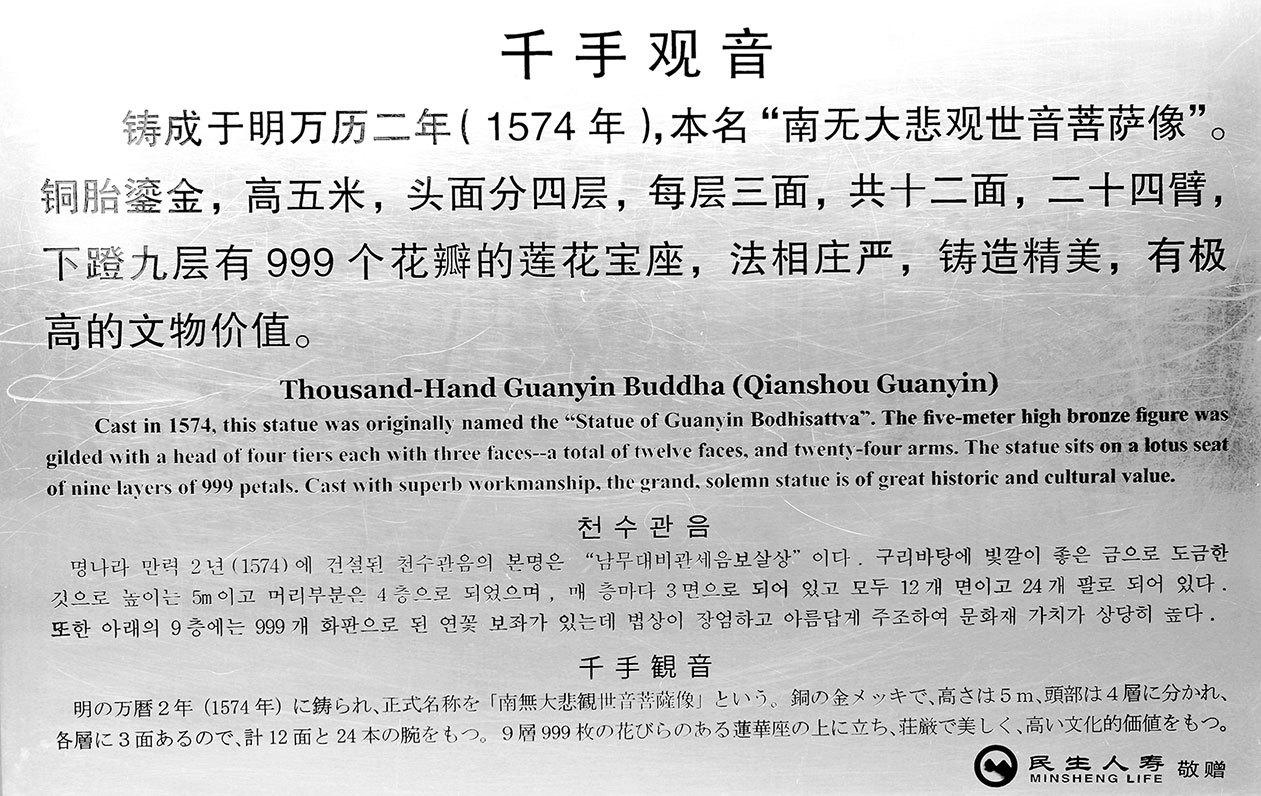 Рис. 28. Музейная табличка с описанием «Тысячерукого Будды Гуань-юня» на китайском, английском, корейском и японском языках. Ан-глийский текст: «Thousand-hand Guanyin Buddha (Qianshou Guanyin). Cast in 1574, this statue was originally named the «Statue of Guanyin Bodhisattva». The five-meter high bronze figure was gilded with a head of four tires, each with three faces – a total of twelve faces, and twenty-four arms. The statue seats on a lotus seat of nine layers of 999 petals. Cast with superb workmanship, the grand, solemn statue is of great histоric and cultural value». (Тысячерукий Будда Гуаньюнь (Сяньшу Гуаньюнь). Созданная в 1574 году, эта статуя первоначально называлась «Статуя Гуаньюня Бодисаттвы». Позолоченная бронзовая фигура 5-метровой высоты имела 4 уровневую голову с 3 лицами на каждом уровне – всего 12 лиц, и 24 руки. Статуя покоится на лотосе с 999 лепестками на 9-уровнях. Очень искусно изготовленная, эта величественная, торжественная статуя имеет огромное историческое и культурное значение.) Фотография 2009 года.