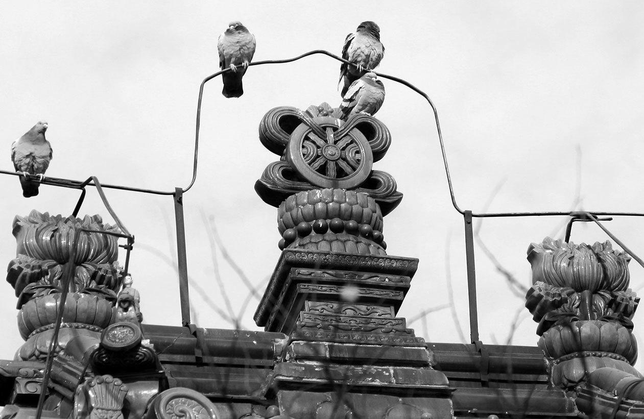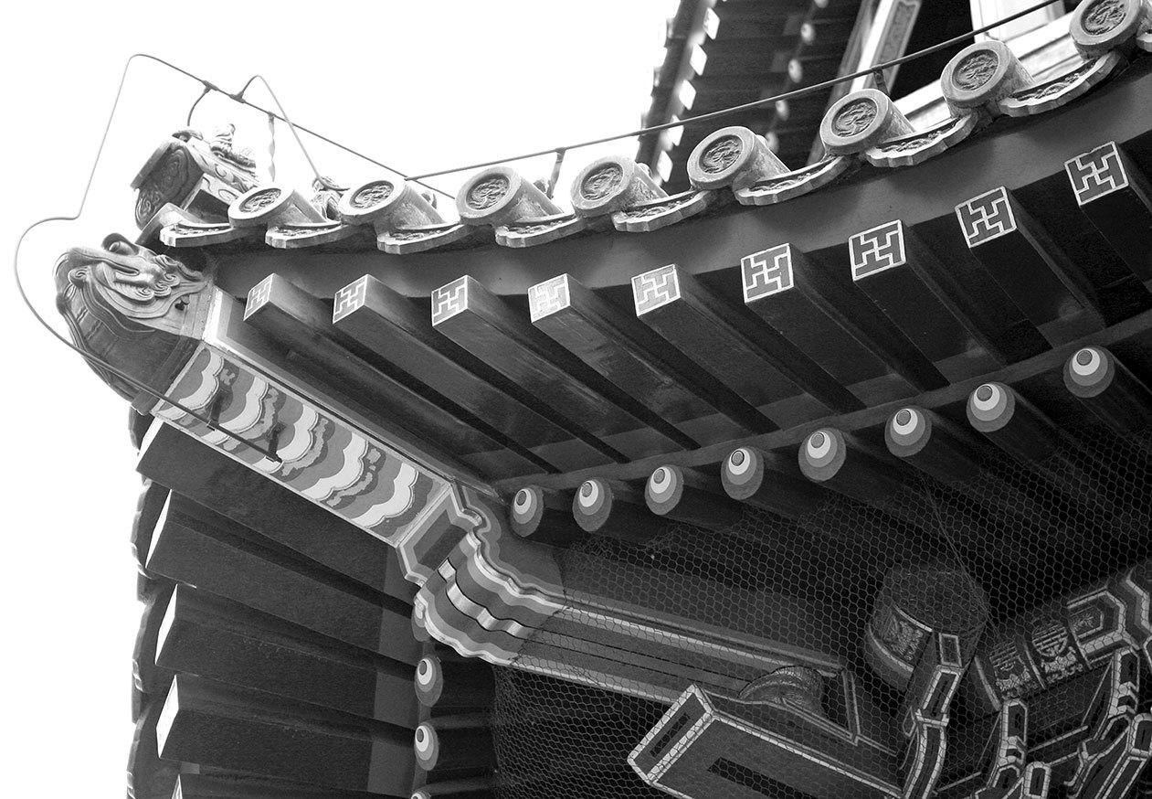 Рис. 29. Угол одного из скатов кровли храма Тысячерукого Будды Гуаньюна. Видны много-численные свастики. Фотография 2009 года.