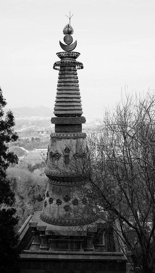 Рис. 30. Буддийский конусообразный столп с полумесяцем наверху, установленный в Летнем дворце манжурских императоров в Пекине. На полумесяце помещен круг, вероятно, изображающий Солнце, а над ним – шар, крестообразно объятый 4-мя языками пламени. Фотография 2009 года.