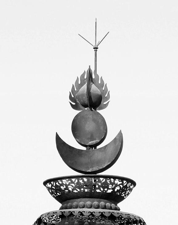 Рис. 31. Буддийский полумесяц с крестом: полумесяц, Солнце, а над ними шар – вероятно, Вселенная – крестообразно объятый языками пламени. Фотография 2009 года.