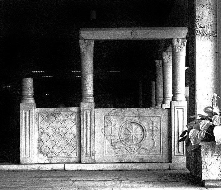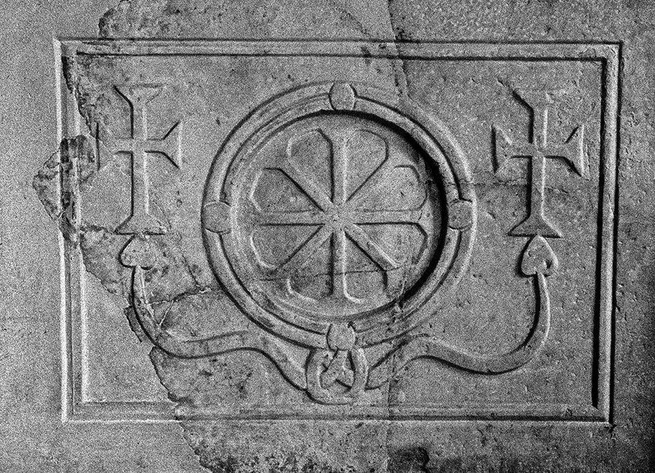 Рис. 34. Остатки небольшого старинного христианского храма, выставленные в археологическом музее города Скопье (Македония). Восьмиконечный крест на стене храма изображен в виде колеса. Фотография 2005 года.