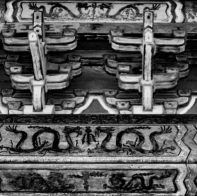 Рис. 36. Два дракона, обращенных лицом друг другу. Между ними узор, напоминающий крест. Изображение над входом в храм Трех Будд в Летнем дворце манжурских императоров в Пекине. Фотография 2009 года.
