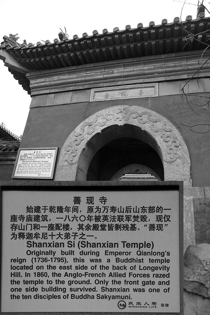 Рис. 12. Ворота, оставшиеся от разрушенного англо-французскими войсками буддийского храма Шаньсянь в Летнем дворце манжурских императоров в Пекине. Слева внизу представлена в увеличенном виде табличка, висящая на этих воротах. Она гласит (в переводе с английского на русский): «Храм Шаньсянь. Этот буддийский храм, расположенный на восточной стороне заднего склона Холма Долголетия, первоначально был возведен в правление императора Сяньлуна (1736–1795). В 1860 году англо-французские объединенные силы сравняли его с землей. Сохранились лишь ворота и одна пристройка. Шаньсянь был одним из 10 учеников Будды Сакьямуни». Фотография 2009 года.