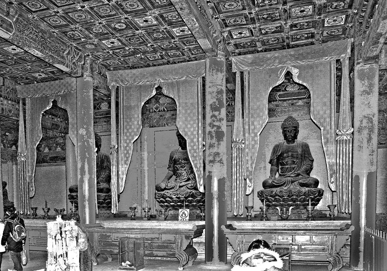 Рис. 16. Три изваяния Будды в трех состояниях (буддийская Троица) в буддийском храме манжурских императоров в их Летнем дворце в Пекине. Снимок сделан снаружи, через открытое окно, поскольку фотографировать в храме запрещено, а в китайских альбомах и путеводителях многочисленные буддийские памятники, как правило, обходят молчанием, упоминая лишь о некоторых из них. Фотография 2009 года.