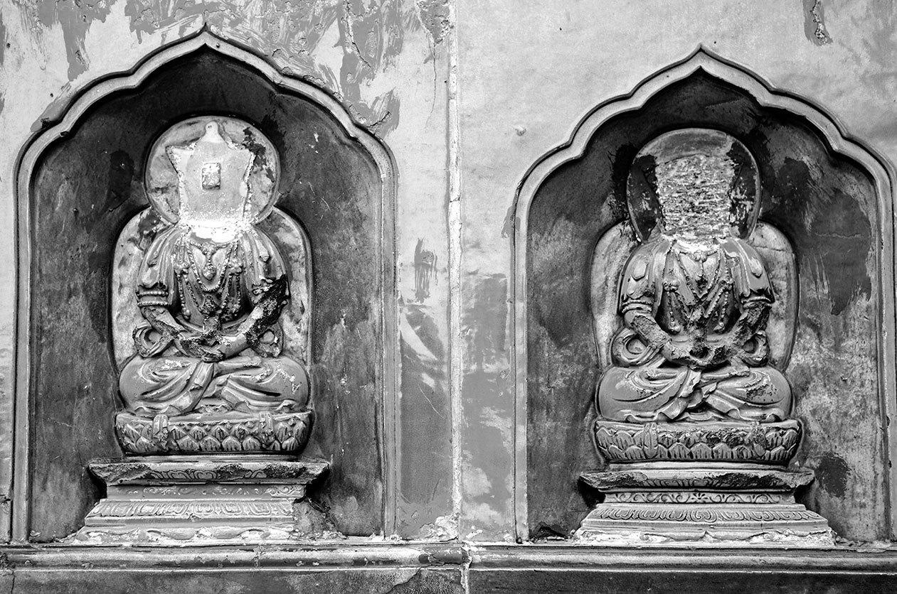 Интересно – кому и зачем понадобилось сбивать лица Будд на стенах манжурского храма в Пекине?