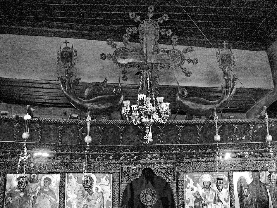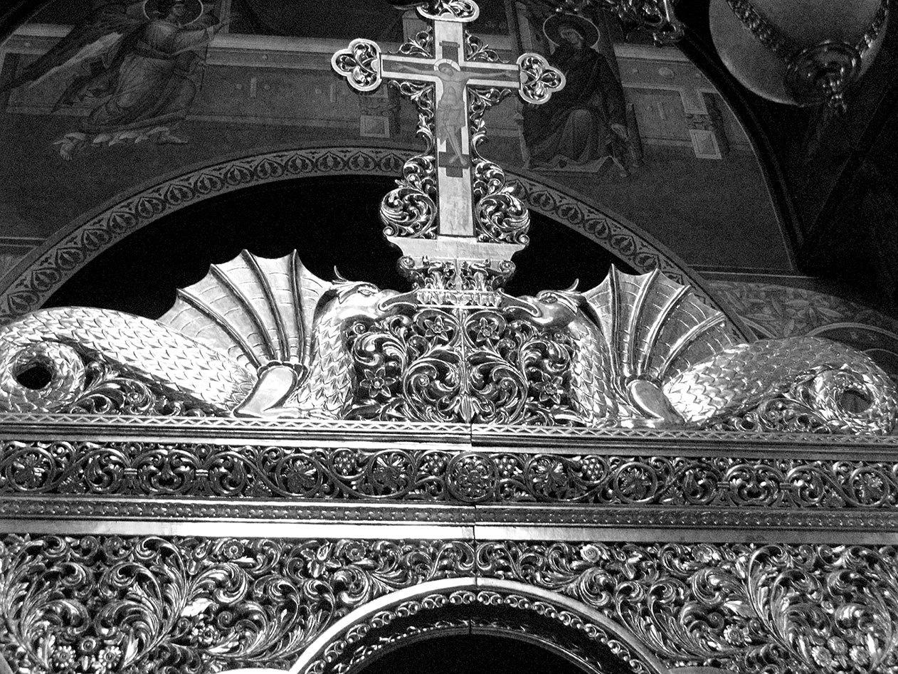Рис. 40. Драконы, стоящие по бокам от креста на иконостасе в церкви греческого города Верая (Veraia), держат на своих трех головах православные иконы. Фотография Н.Д. Гостева, 2011 год.