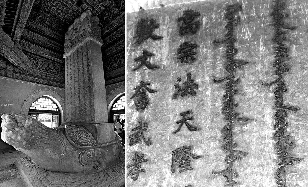 Рис. 44. Каменная черепаха с надписью по-китайски и по-манжурски, относящаяся к гробнице Цяньлуна и фрагмент надписи на ней: слева китайские иероглифы, справа – манжурские. «Маньчжурские буквы пишутся отвесно, сверху вниз, и следовательно строки ведутся также вертикально по китайскому образцу, но только от левой руки к правой, тогда как у китайцев наоборот» [292:1], с. 47. Фотография 2010 года.