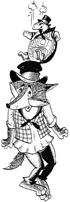 Матушка Мидоус с девочками – те подняли крик и визг, а Братец Черепаха подполз к краю полочки и свалился оттуда – да как плюхнется Лису на макушку! Он вроде как бы оглушил Лиса.