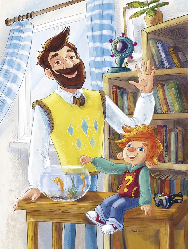 Здравствуйте, ребята! Меня зовут Чевостик. Я живу на книжной полке в библиотеке у дяди Кузи. Не удивляйтесь: я небольшого роста, а нижняя полка в книжном шкафу дяди Кузи очень высокая и просторная, поэтому мне на ней хорошо и удобно. Какой я? Похож на обыкновенного мальчишку, волосы рыжие, характер весёлый. Дядя Кузя в шутку зовёт меня Чевочкой с хвостиком. Но никакого хвоста у меня нет, зато есть ушки на макушке. Больше всего на свете я люблю узнавать новое, поэтому всё время задаю дяде Кузе всякие вопросы. О чём бы я ни спросил, он всё знает и мне рассказывает. Это потому, что дядя Кузя очень умный. Он прочитал много-много разных книг. А ещё мы с ним любим путешествовать! В путешествиях нам помогает времяскок. Это такой прибор, его дядя Кузя изобрёл. Набираешь на времяскоке место и время, куда хочешь попасть, раз, два — и уже там! Сегодня мы наверняка тоже куда-нибудь отправимся!