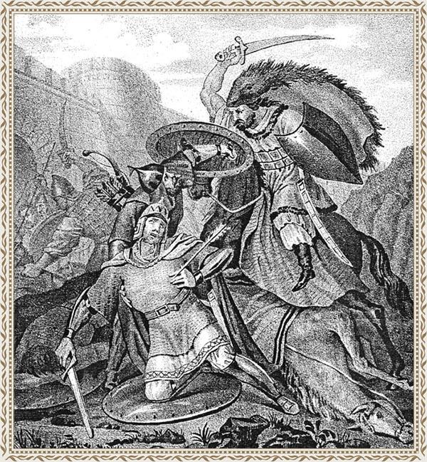 Олег, управляя Новгородом после смерти Рюрика, слышал, что все приезжавшие из Киева хвалили новое княжество, и вздумал завоевать его. Но он знал, что князья киевские и народ их храбры, что они будут сражаться с такою же смелостью, как и его воины, и потому решил употребить хитрость. Подойдя к Киеву, он оставил войско сзади, приплыл к киевскому берегу в небольшой лодке только с Игорем и несколькими воинами и послал сказать государям киевским, что с ними желают видеться купцы варяжские из Новгорода, их друзья и земляки. Аскольд и Дир были очень рады таким гостям и тотчас отправились на лодку. Но только они вошли туда, воины Олега окружили их, а сам Олег, подняв на руках маленького Игоря, сказал: «Вы не князья, но я князь, и вот сын Рюрика!»