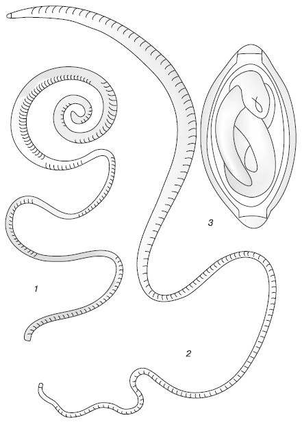 Рис. 1.1. Власоглав: 1 – самец; 2 – самка; 3 – личинка в яйце