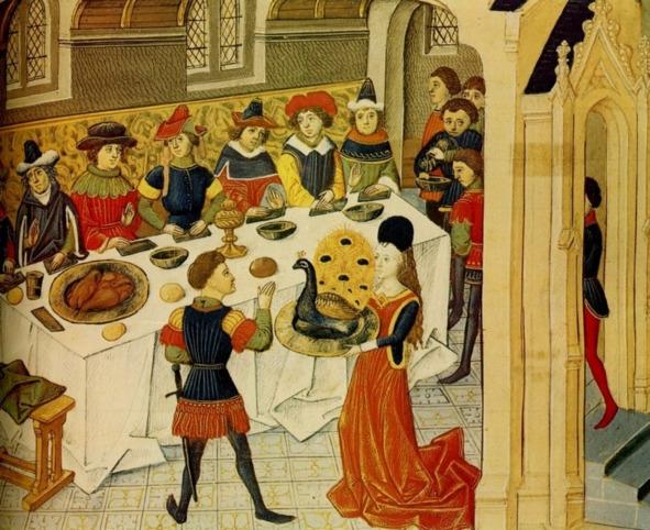За столом было принято давать различные клятвы. Часто клялись на каких-нибудь птицах: фазане, павлине, цапле. Предварительно выносили либо живую ее (в последствии птицу готовили и ритуально съедали), либо, что бывало чаще, уже приготовленную, но как бы живую: с оперением, распушенным хвостом, из клюва мог вырываться огонь и т. п. Клятва «на фазане» и прочей птице считалась самой твердой, изменить ей было никак нельзя. Нередко гости клялись один за другим, в порядке рассадки за столом. Страсти при этом кипели нешуточные. Еще бы, ведь на кону стояла не только личная честь, но и нередко судьбы целых наций. Вот, например, как было принято решение о начале столетней войны между Англией и Францией.