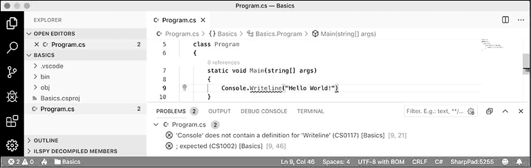 3. Выберите View—>Problems (Вид—>Проблемы) либо нажмите сочетание клавиш Ctrl+Shift+M или Cmd+Shift+M и обратите внимание, что ошибки кода подчеркиваются красной волнистой линией, а подробная информация отображается на панели PROBLEMS (Проблемы), как показано на рис. 2.1.