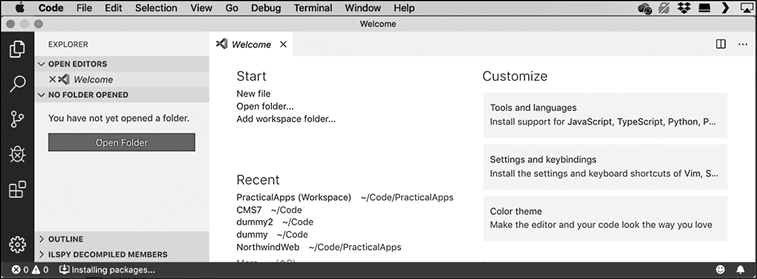 Visual Studio Code — редактор кода для разработки кросс-платформенных приложений. Поэтому я решил использовать данную программу во всех главах книги, кроме двух последних, где требуются недоступные в Visual Studio Code специальные функции для разработки приложений в операционной системе Windows и мобильных приложений.