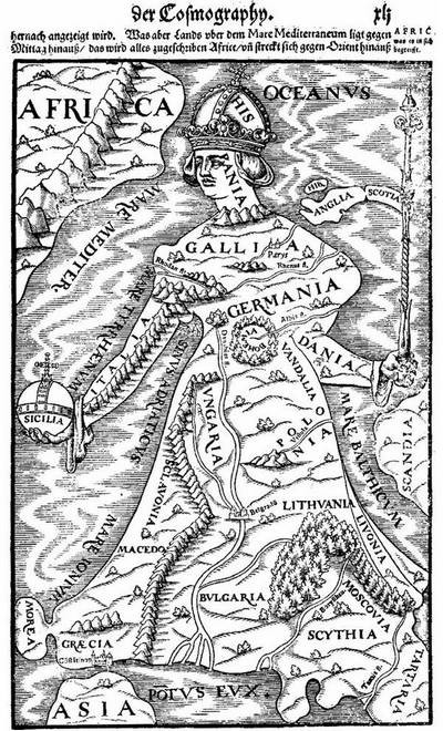 Данное «удаление Азии», по справедливому замечанию М. Винтля, было вызвано тем, что Великие географические открытия как бы уменьшили размеры европейского континента в глазах западных картографов. Первой их реакцией на это было увеличение Европы, продвижение ее границы на восток, с Танаиса за Волгу. Второй – появление иконографического триумфализма, размещения на картах аллегорических изображений Европы, Азии, Африки, Америки в виде молодых женщин, среди которых Европа – несомненная королева[43]. На стилизованном рисунке в издании «Космографии» С. Мюнстера 1588 года Европа изображена в виде женщины, голова которой – Испания, плечи – Франция и Англия, грудь – Германия, руки – Дания и Италия, живот – Вандалия, Польша и Венгрия, ноги – Македония, Славония, Литва и Ливония, а на подоле платья размещены Греция, Болгария, Скифия, Московия и Татария. При этом Европа-королева попирает ногами Азию (см. ил. 2). В «Иконологии» Цезаре Рипы 1603 года художникам рекомендовалось рисовать Европу всегда в короне, «чтобы показать, что Европа всегда является главой и королевой всего сущего»[44].