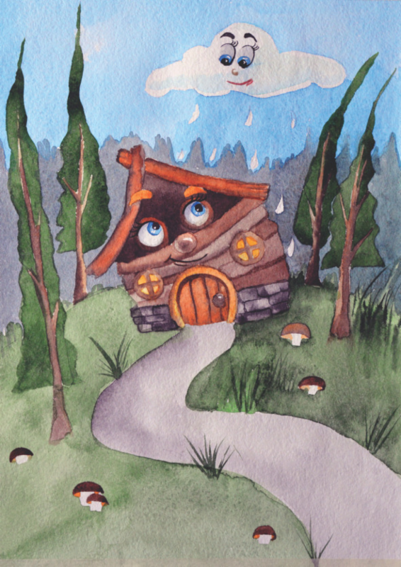 Вечером над Домиком прохудилась Тучка, и зарядил дождик. Сначала Домик обрадовался, что будет очень чистым, и даже подставлял разные бока, чтобы дождик их искупал. Но Небесный Мастер потерял иголочку, чтобы зашить Тучке бочок, и ушёл за ней в другую Синюю страну, и из тучки лился и лился дож