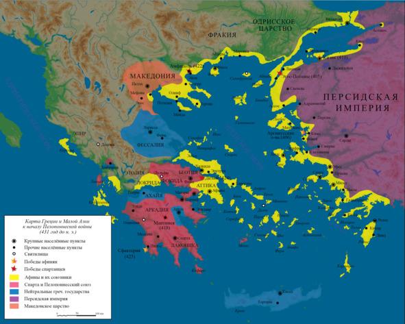 Греция и Малая Азия накануне Пелопонесской войны (431 г. до н.э.). За Афины выступают многочисленные, относительно независимые греческие колонии