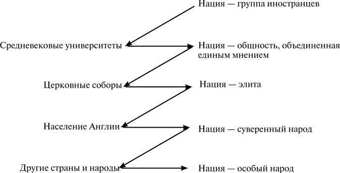 Структурные (ситуативные) рамки, с помощью которых формируются новые понятия (значения слов), заставляют процесс семантической трансформации постоянно менять направление. В то же самое время структурные рамки осмысляются, интерпретируются или определяются в терминах этих понятий. Определение ситуации меняется с возникновением данных понятий, которые, в свою очередь, переориентируют действие. Социальная сила и психологические эффекты подобной переориентации варьируются в соответствии со сферой применения понятия и в зависимости от того, насколько главенствующим является место этого понятия во всем существовании субъекта действия. Студент средневекового университета, принадлежащий к той или иной нации, был в состоянии понять, где ему следует жить, с какими людьми он будет наиболее тесно общаться и поддержки каких специфических мнений от него ожидают в течение нескольких лет его учебы. В другое время его «национальная идентичность», скорее всего, ни в поведении, ни в самовосприятии никак не проявлялась: вне узкой университетской сферы это понятие приложения не имело. Влияние столь же мимолетной национальной идентичности на участника церковного собора могло быть гораздо глубже. Членство в нации определяло его как человека с очень высоким статусом. Воздействие такого определения на самовосприятие могло стать постоянным, и давнишняя память о национальности могла влиять на поведение человека существенно дольше, чем длились соборные дискуссии, даже когда его нации больше не существовало.