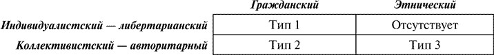 Эти две различные интерпретации верховной власти народа и лежат в основе двух типов национализма, один из которых можно определить как индивидуалистический – либертарианский (обладающий свободой воли), а второй – как коллективистский (авторитарный). Кроме того, национализмы могут различаться по критерию членства в национальной общности, который может быть как гражданским, то есть членство тождественно гражданству, так и этническим. В первом случае национальность, в принципе, является открытой и добровольной, ее можно, а иногда и нужно получить. Во втором случае считается, что национальность есть нечто врожденное, приобрести ее нельзя, если у человека ее нет, и нельзя изменить, если она имеется, к личной воле она не имеет никакого отношения и является как бы генетической характеристикой. Индивидуалистический национализм не может не быть гражданским, но гражданский национализм может быть также и коллективистским. Чаще, однако, коллективистский национализм принимает форму этнического партикуляризма, а этнический национализм непременно бывает коллективистским. (Рис. 3).