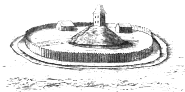 Опустошительные набеги неприятелей побуждали к построению таких укреплений, которые могли бы служить надежными убежищами. Первые замки представляли собою земляные окопы, более или менее обширных размеров, окруженные рвом и увенчанные деревянным палисадом. В таком виде они походили на римские лагеря, и это сходство, конечно, не было простой случайностью; несомненно, что эти укрепления устраивались по образцу римских лагерей. Как в центре римского лагеря возвышался преторий (praetorium)[1], так посреди пространства, замыкавшегося замковым валом, поднималось естественное или по большей части искусственное земляное возвышение конической формы. Обыкновенно на этой насыпи воздвигалось деревянное строение, входная дверь которого находилась на самом верху. Таким образом, попасть в это строение можно было, только взобравшись на самую насыпь. Внутри насыпи был ход в подземелье с колодцем.