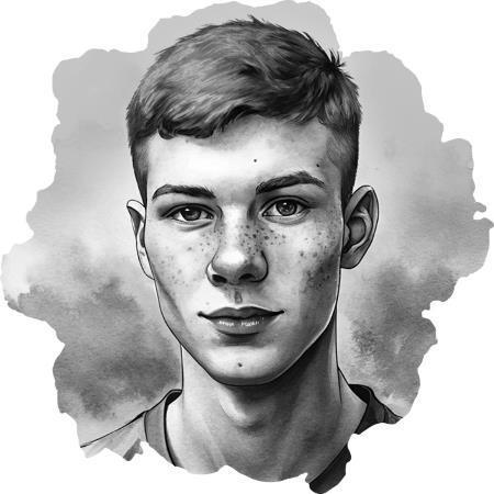 Внешность: конопатый, рыжий ежик волос, низкий рост и длинная шея, из-за чего напоминает гусенка