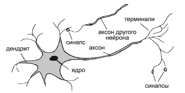 Рис. 2.1. Нейрон, считывающий сигнал с соседских аксонов с помощью дендритов