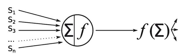 Рис. 2.3. Упрощенная схема суммирования сигналов в нейроне. Сумма входящих подставляется в функцию активации. Результат подается на единственный выход, где его уже ждут благодарные нейронные соседи