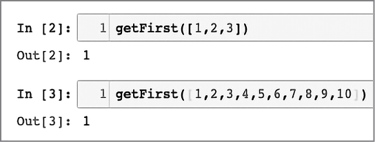 Если выполнение алгоритма занимает одинаковое количество времени независимо от размера входных данных, то про него говорят, что он выполняется постоянное время. Такая сложность обозначается как O(1). В качестве примера рассмотрим доступ к n-му элементу массива. Независимо от размера массива для получения результата потребуется одно и то же время. Например, следующая функция вернет первый элемент массива (ее сложность O(1)):