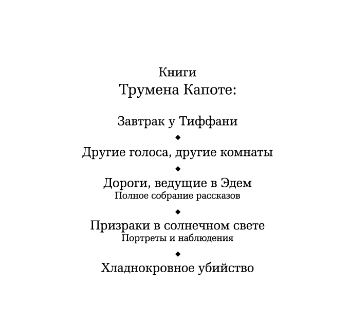Трумен Капоте, автор таких бестселлеров, как «Голоса травы», «Хладнокровное убийство» и «Завтрак у Тиффани» (самое знаменитое произведение Капоте, прославленное в 1961 году экранизацией с Одри Хепберн в главной роли), входит в число крупнейших американских прозаиков ХХ века. Многие, и сам Капоте в том числе, полагали, что именно в рассказах он максимально раскрылся как стилист («Именно эта литературная форма — моя величайшая любовь», — говорил он). В данной книге вашему вниманию предлагается полное собрание короткой прозы выдающегося мастера.