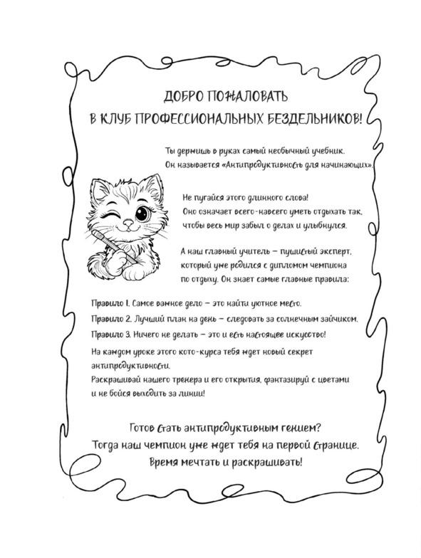 Уникальная раскраска-антистресс «Антипродуктивность для начинающих. Кото-курс от чемпиона по отдыху». Освойте искусство осознанного отдыха вместе с милым и мудрым котенком! Вас ждут: — Уютные иллюстрации в милом мультяшном стиле; — Простые сюжеты, понятные и детям, и взрослым; — Толстые контуры — идеально для раскрашивания любыми материалами. Освойте искусство осознанной лени через творчество. Идеальный подарок для всех, кто ценит моменты спокойствия и хочет научиться отдыхать по-настоящему.